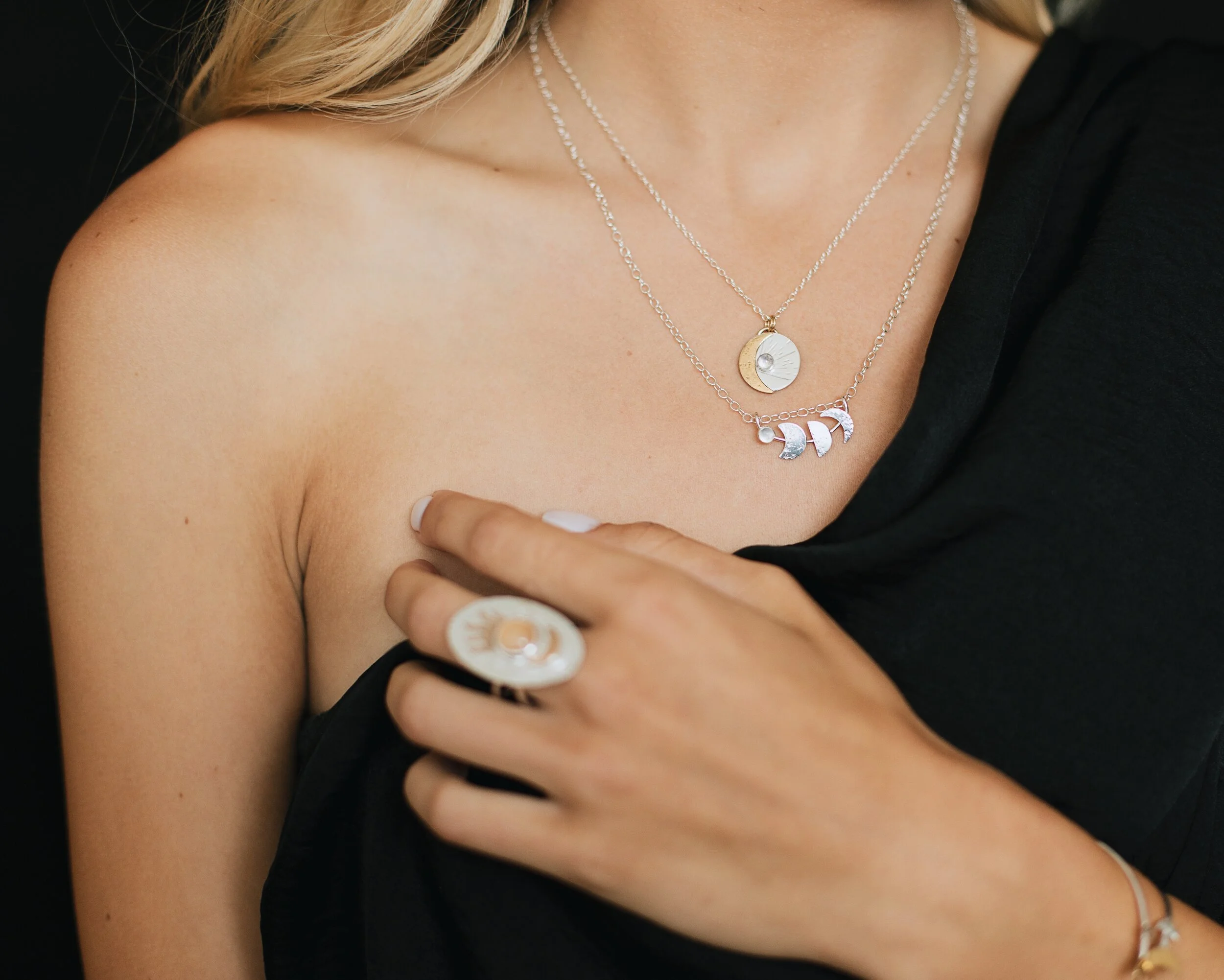This capsule collection was inspired by the stars and celestial bodies within them. A mixture of semi precious stones set along side 14K gold fill and sterling silver. This collection of small and delicate pieces is meant to connect you to the stars. We are all made of Stardust. Available until sold out.