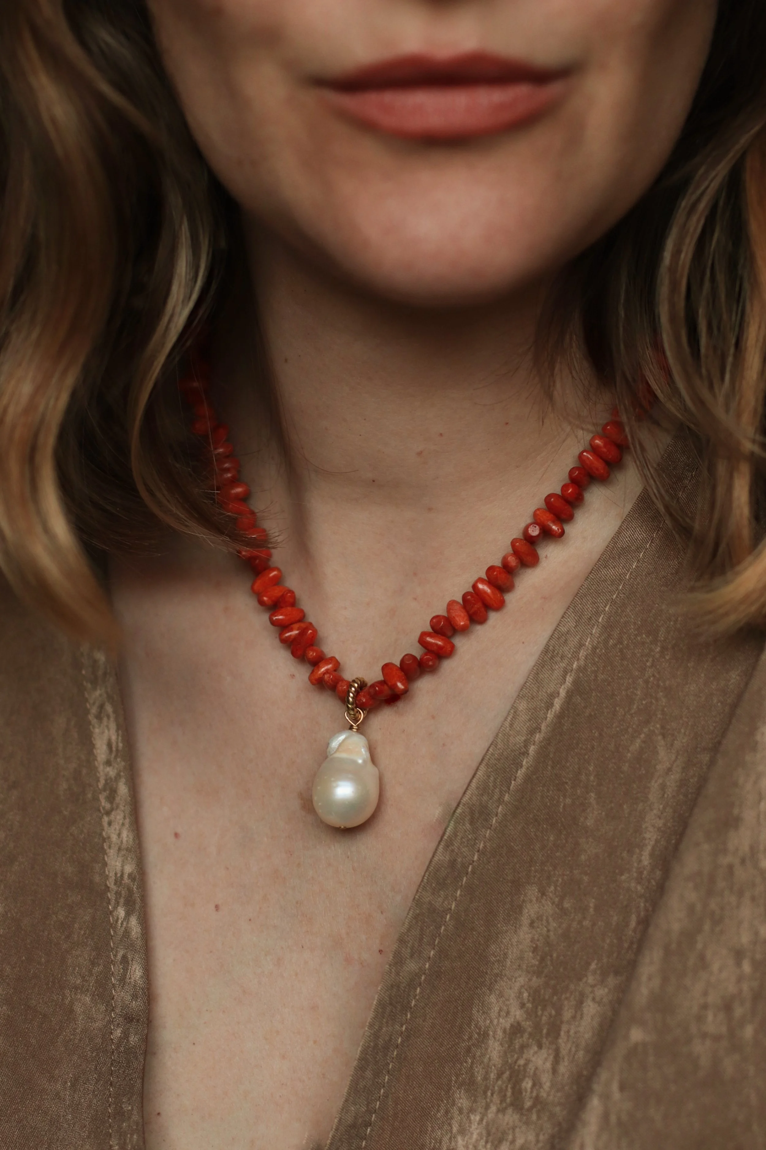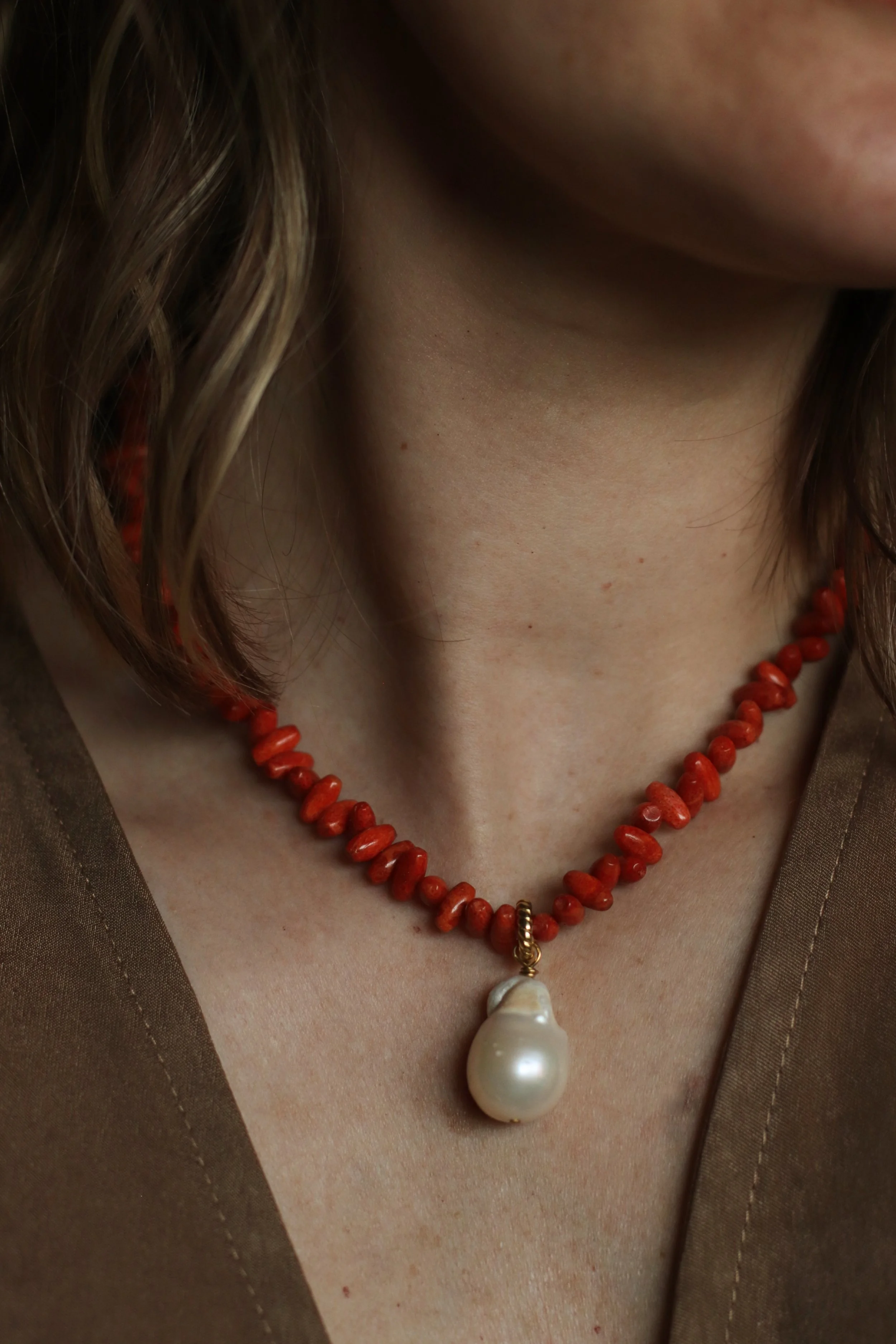 Cire’ Alexandria exclusive pendant. Created with wax a cast in solid bronze. Strung with genuine fresh water pearls. Solid brass extender chain.