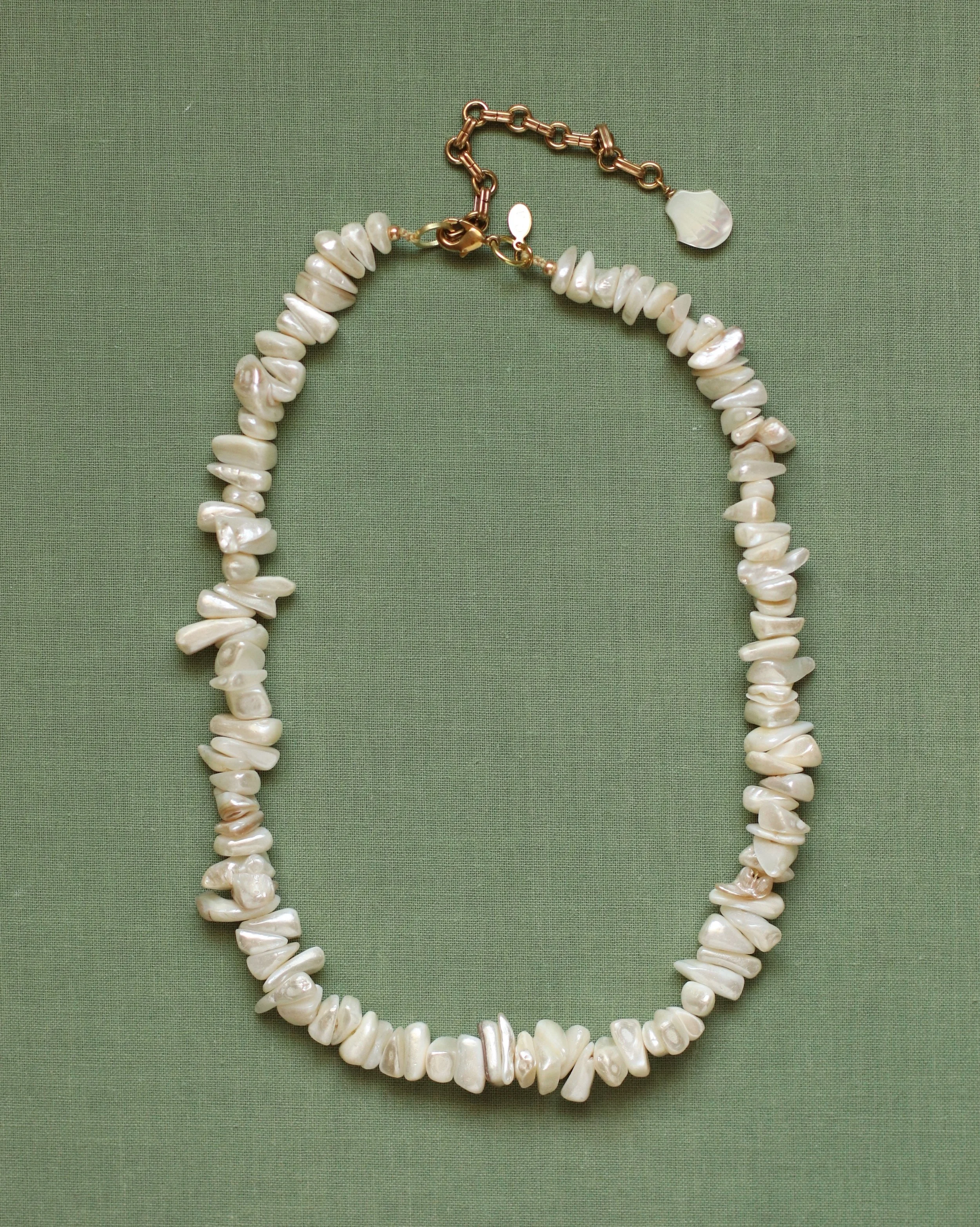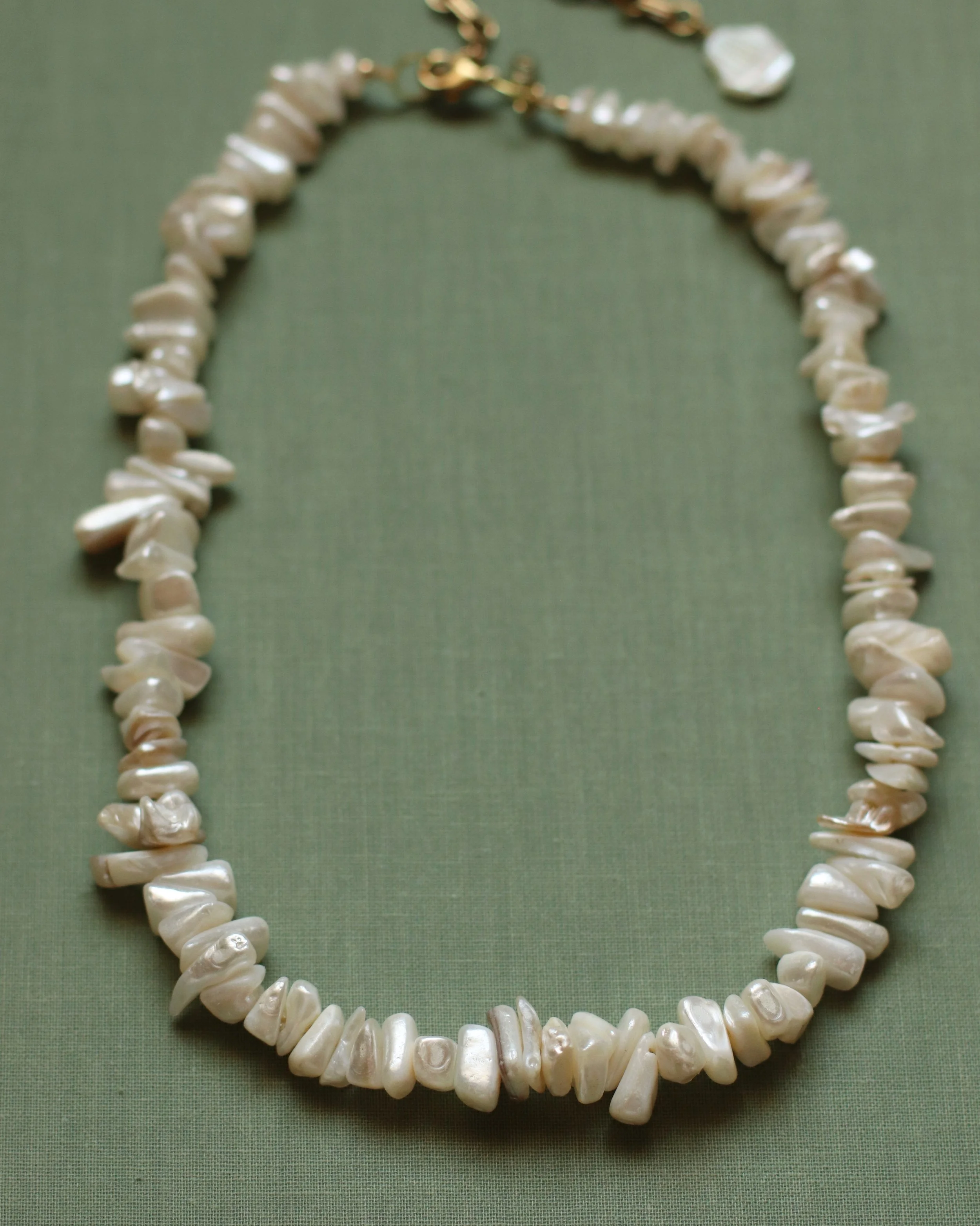 Created with faceted jade rhondelles and fresh water baroque pearl focal bead. Solid brass extender chain.